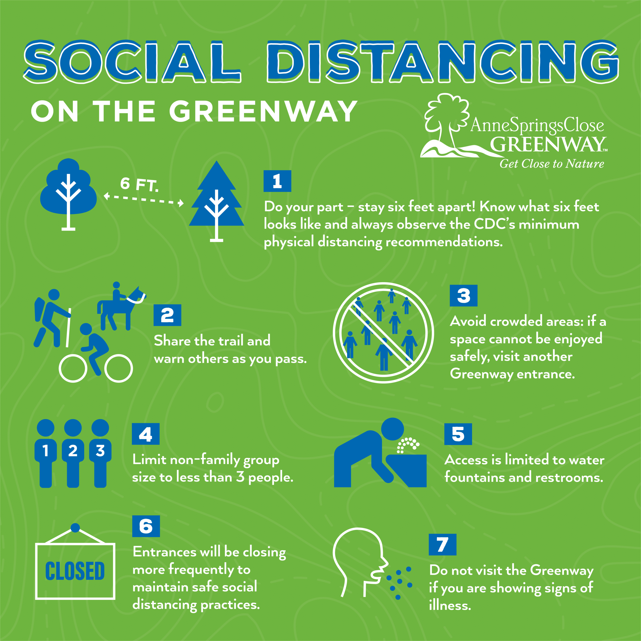 Text reading “Social Distancing on the Greenway: 1. Do your part- stay 6 feet apart! Know what 6 feet looks like and always observe the CDC’s minimum physical distancing recommendations 2. Share the trail and warn others as you pass 3. Avoid crowded areas: if a space cannot be enjoyed safely, visit another Greenway entrance. 4. Limit non-family group size to less than 3 people 5. Access is limited to water fountains and restrooms 6. Entrances will be closing more frequently to maintain safe social distancing practices 7. Do not visit the Greenway if you are showing signs of illness”