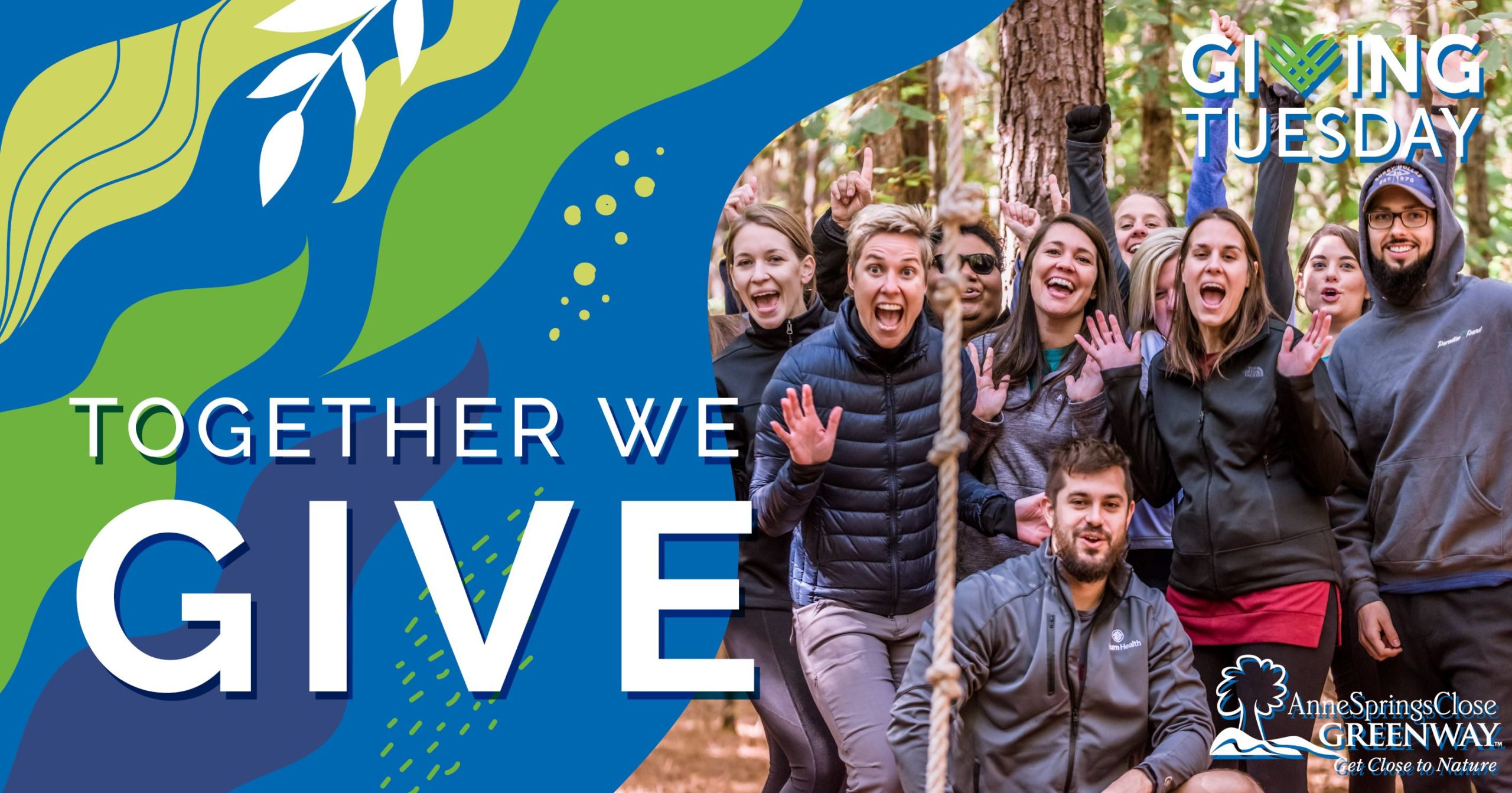Photo of Anne Springs Close Greenway staff posing with excitement with text "Giving Tuesday together we give"