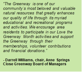 alt=Quote from Anne Springs Close Greenway's Board of Directors member Darrell Williams reading "The Greenway is one of our community's most beloved and valuable natural resources that greatly enhances our quality of life through its myriad educational and recreational programs and activities. We encourage area residents to participate in our Love the Greenway Month activities and support the Greenway through their memberships, volunteer contributions, and financial donations."
